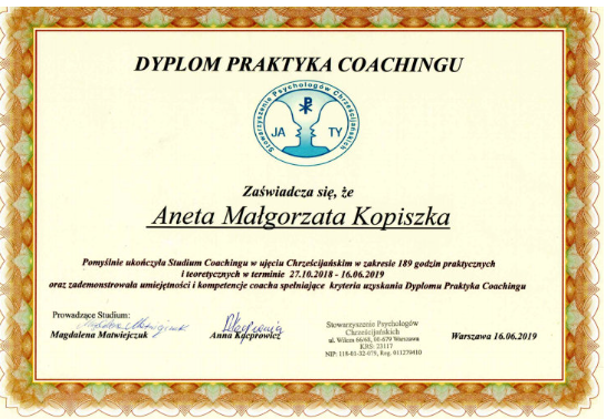 Wspieram poprzez coaching jako PCC ICF (Professional Certified Coach International Coaching Federation), Coach Chrześcijański, Konsultant Kryzysowy Instytutu Pozytywnej Terapii Kryzysu.